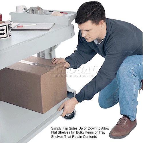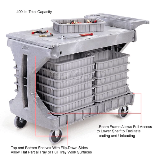 Cart sides flip up or down on top and bottom shelves to offer versatility of a full or partial tray or a smooth, flat work surface. Solid space saving I-beam frame doesn’t obstruct access to lower shelf like four post carts. Ergonomic handle offers built in storage compartments – perfect for tools, pens, cups and more. Heavy-duty structural foam construction yields 400 lb. capacity (200 lb. per shelf). 5″ casters offer easy, smooth rolling and two locking brakes.