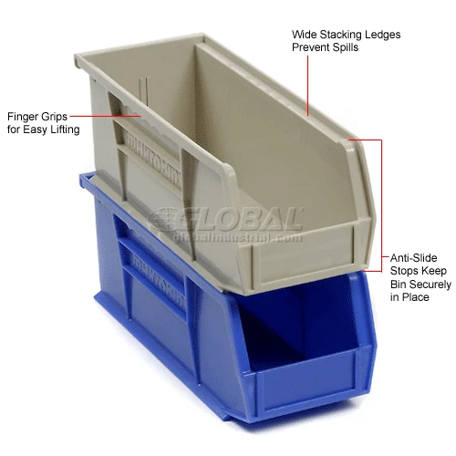Strong industrial grade polymer bins hang or stack to accommodate your storage needs. Features include extra wide stacking ledge and finger grips for easy handling. Anti-slide stops and reinforcing ribs help prevent shifting and spreading when full. Large label slot provides quick inventory identification. Withstands 250°F temperatures. Sold in carton quantities.