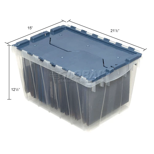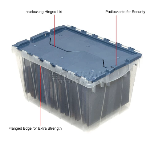 This high density industrial grade polymer container has reinforced ribs and closes with a padlockable hinged lid that interlocks for extra strength. Nest when open to save space. Molded hand grips allow easy lifting. Full length stainless steel hinge pins ensure security. See-through design allows quick identification of contents. Includes metal rails for hanging file folders. Sold in carton quantities of 6.