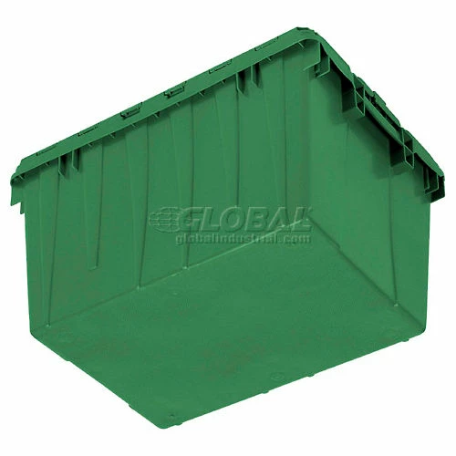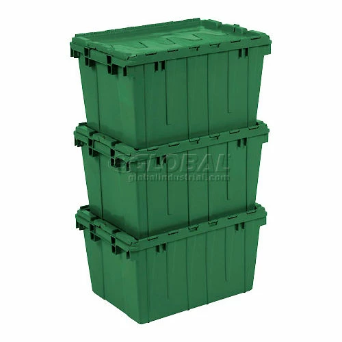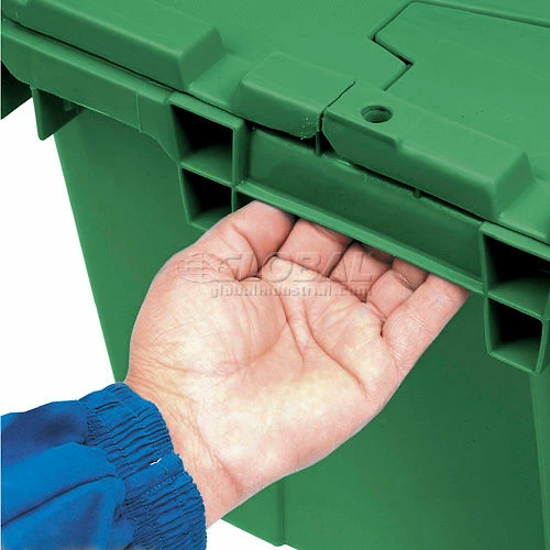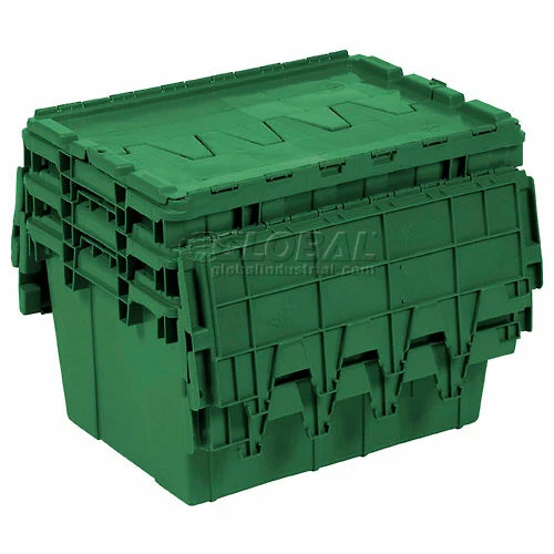 Heavy-duty Returnable and reusable Versatile high-density gray containers made of industrial grade polymers have permanently attached flip-up lids that interlock for stacking strength and can be locked with security seals. Solid bottom. Boxes nest with lids open. 27″L X 16-7/8″W X 12-1/2″H. Sold in quantities of 4.