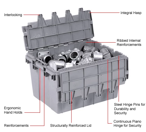 Heavy-Duty Returnable & Reusable Versatile high-density gray containers made of industrial grade polymers have permanently attached flip-up lids that interlock for stacking strength and can be locked with security seals. Solid bottom, Boxes nest with lids open. 21-1/2″L x 15-1/4″W x 12-1/2″H. Sold in quantities of 6.