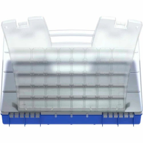 Large lid storage organizer 18- 1/4 x 13-3/8 x 3-3/8Clear lid Blue bottom 12-62 compartments separate lid compartment holds smaller items. Main compartment olds larger, bulky items Dividers included for both levels molded-in feet allow case to stand upright