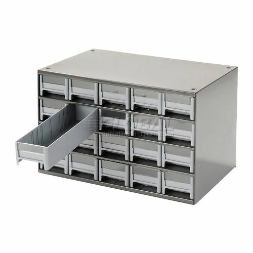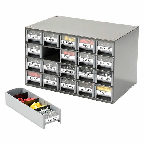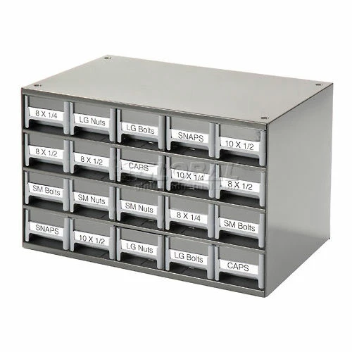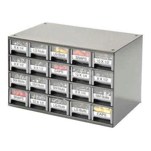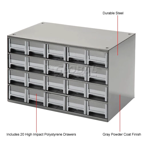 This modular 20 multi-drawer steel frame cabinet features galvannealed steel frame with a gray powder coat finish, make it rust proof, chip proof and scratch resistant. High impact styrene scoop bottom drawers with clear fronts and molded in label holder. Overall cabinet size is 17″W x 11″D x 11″H. Nesting “feet” for stable stacking. Includes two dividers and one label per drawer.