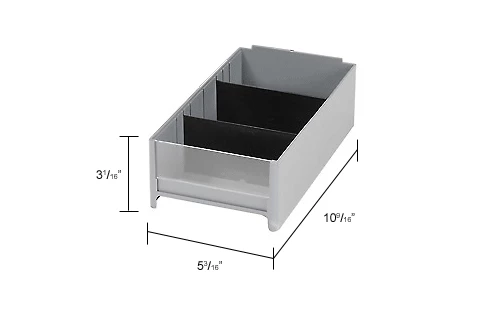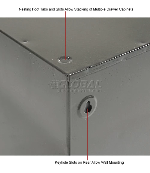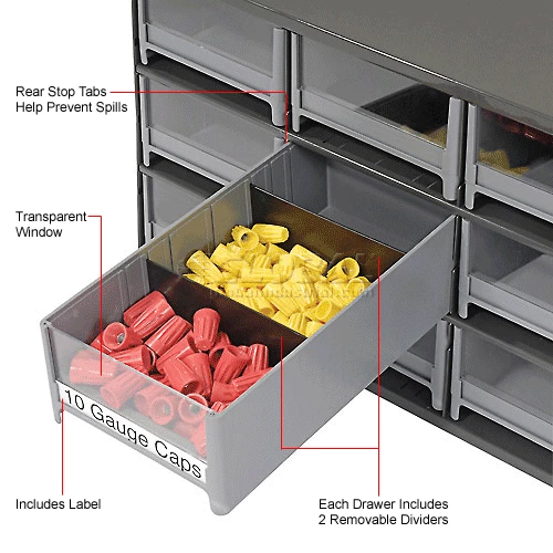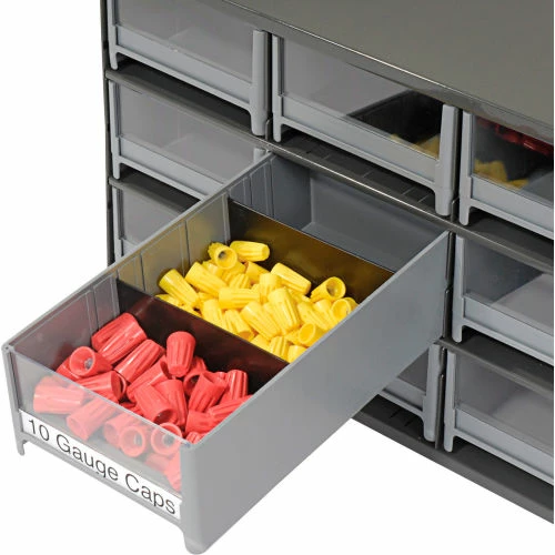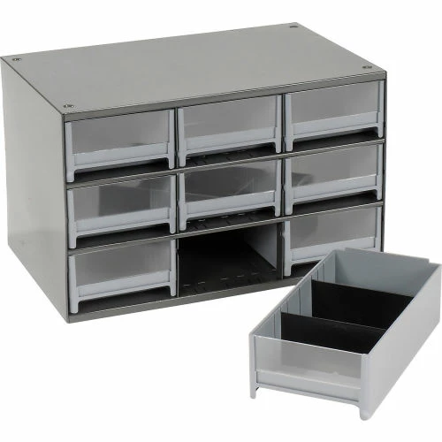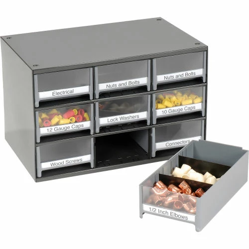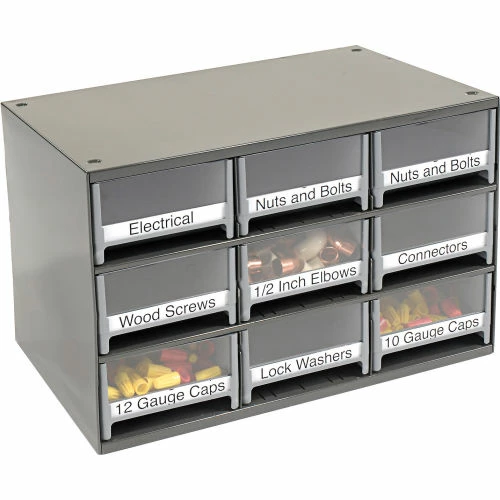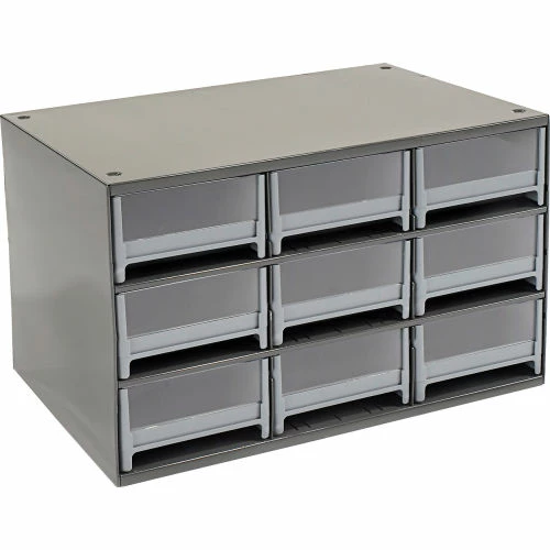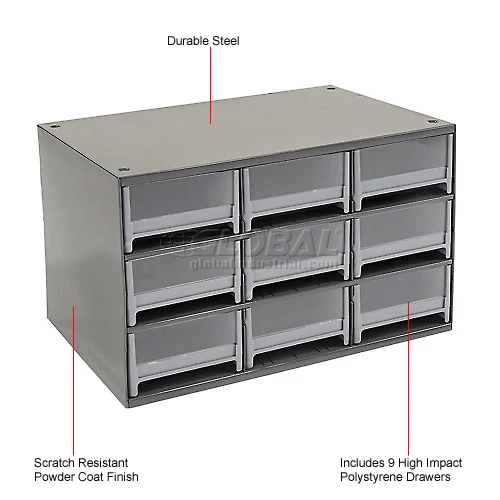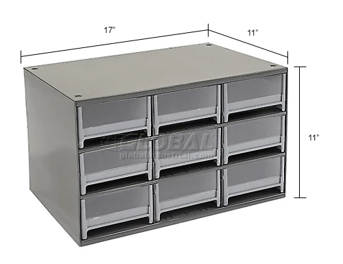 This modular 9 multi-drawer steel frame cabinet features galvannealed steel frame with a gray powder coat finish, make it rust proof, chip proof and scratch resistant. High impact styrene scoop bottom drawers with clear fronts and molded in label holder. Overall cabinet size is 17″W x 11″D x 11″H. Nesting “feet” for stable stacking. Includes two dividers and one label per drawer.