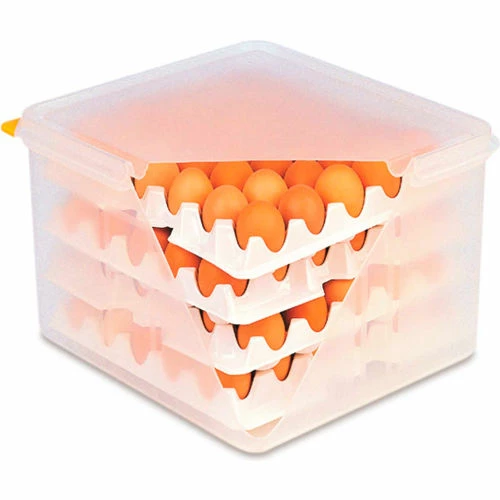 Egg Container for 120 eggs. 2.3 Qt. capacity, includes 8 GN 2/3 polystyrene trays. Each tray hold 30 eggs. The container holds 4 trays (120 eggs) and 4 extra trays are included. Translucent polypropylene container with lid, HACCP compliant.