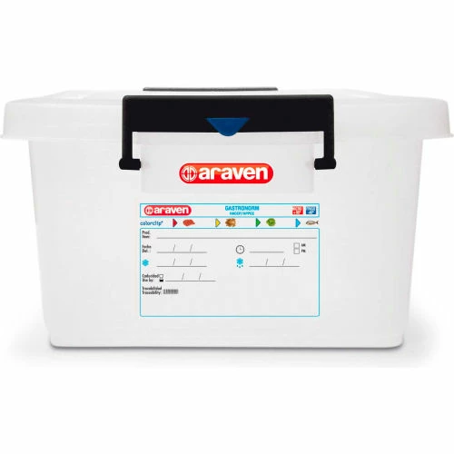 Food Storage Container, 42.2 Qt. capacity, with lid, Colorclip® coded, stackable, permanent label, side handles with fasteners, dishwasher safe, high-density polyethylene, translucent, HACCP compliant.