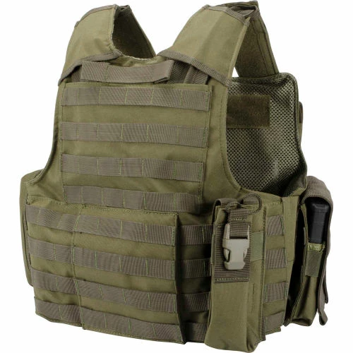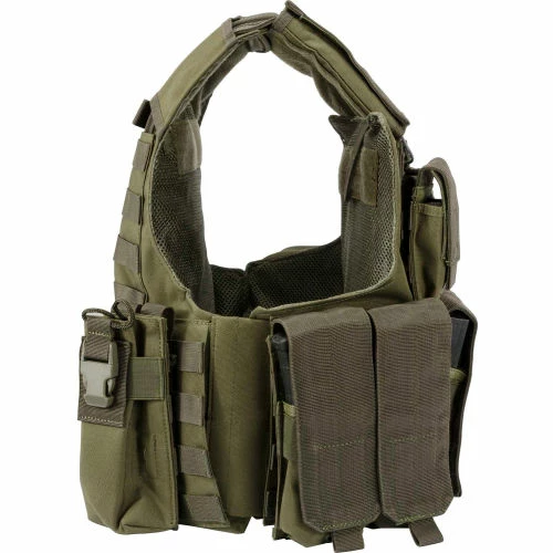 The Loaded Gear VX-300 Tactical Plate Carrier Vest (Green) from Barska features seven detachable pouches to keep ammo and tactical essentials organized and close at hand. It has internal sleeves with hold down straps for user-supplied body armor plates on the back and front of the vest. There is a total of 5 magazine pouches that can accommodate a standard 30 round AR-15/M-4 magazine. The VX-300 Tactical Vest is adjustable to fit most adults, and includes a front touch-fastener area for attaching ID patches. The VX-300 mesh webbing is designed for ventilation and durability, and allows for easy re-configurations. A reinforced rescue pull-handle is located on the upper back of vest, and an integrated MOLE system allows for the attachment of additional accessories.