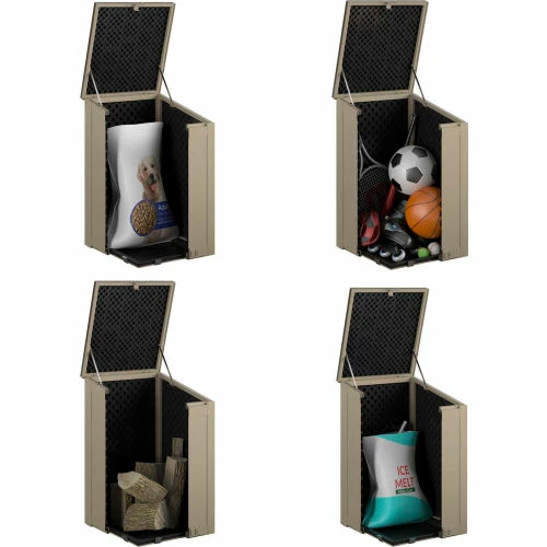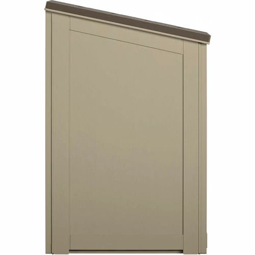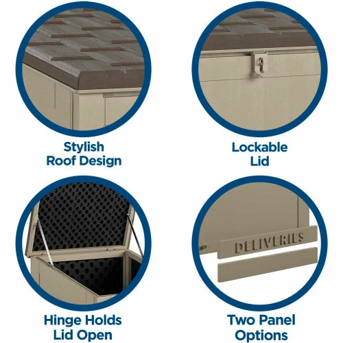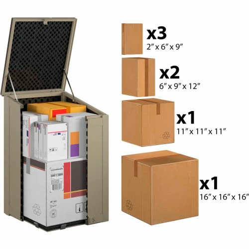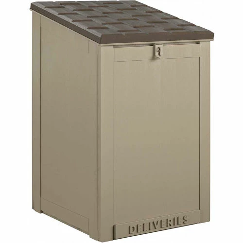 - Durable construction with weather-resistant, double wall panels and angled design of shingled roof keep packages dry. Features dark brown roof and tan siding that will compliment a wide range of home exteriors. 45 gallon storage capacity