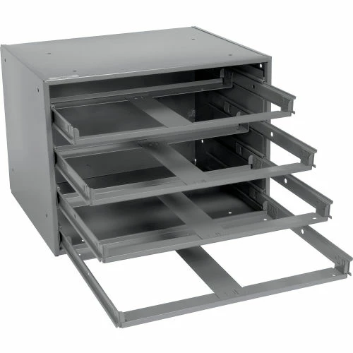 Sturdy construction using prime cold-rolled steel. Each sliding cradle holds up to 40 lbs. Easy glide slides allow boxes to move in and out smoothly. Center braces on sliding cradles provide extra rigidity. Reinforced rack keeps boxes level. Boxes can be easily removed for transport to work areas. Durable gray powder coat finish.