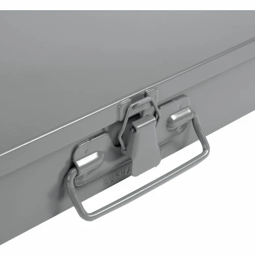 Prime cold rolled steel outer shell. High impact styrene insert. Compartments have scooped bottoms to make part removal easy. Full piano hinge on cover provides rigidity. Positive pull-down catch keeps cover tightly closed to prevent part migration. Handle allows for easy transport. Durable gray powder coat finish.