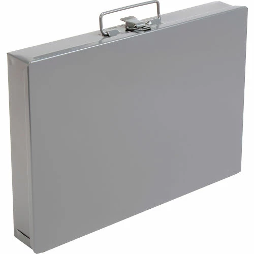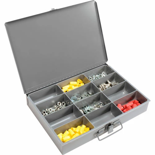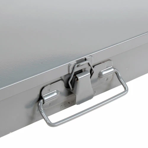 Prime cold rolled steel outer shell. High impact styrene insert. Compartments have scooped bottoms to make part removal easy. Full piano hinge on cover provides rigidity. Positive pull-down catch keeps cover tightly closed to prevent part migration. Handle allows for easy transport. Durable gray powder coat finish.