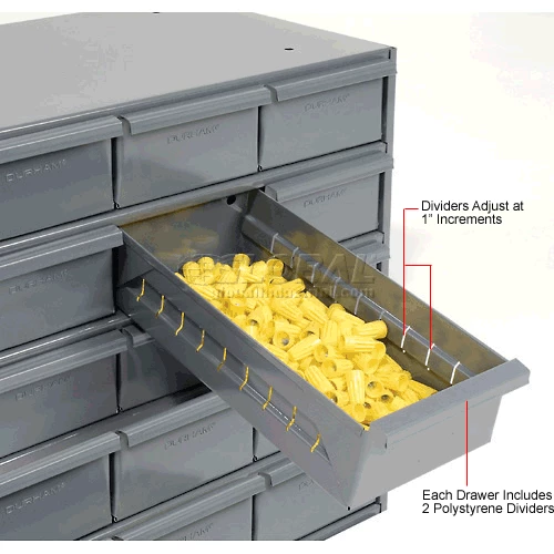Storage cabinets feature balanced, no-drag drawers with newly designed pulls and extra heavy construction. Drawers have 2 dividers which may be adjusted on 1″ increments to provide desired size compartmentalization. Gray powder coat finish.