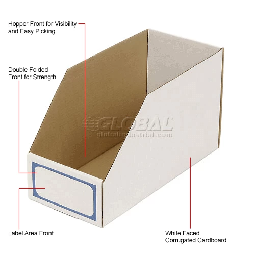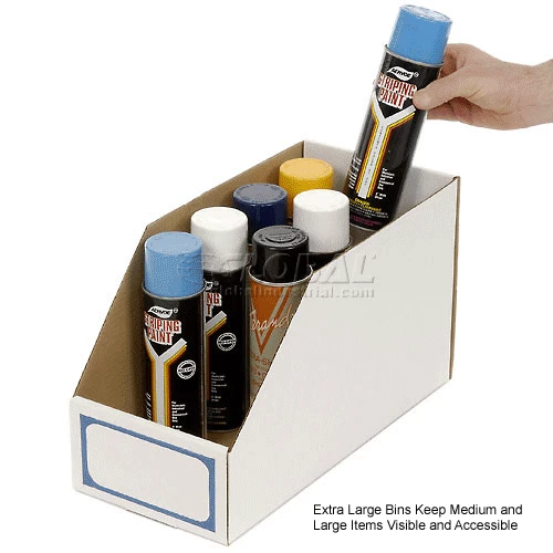 Handy, reusable bins have a thousand and one uses. Keep small parts easily visible and accessible. Constructed of heavy-test white faced corrugated fiberboard. Self-locking for easy set-up, keeps bins rigid. Fits all standard shelving. Features inventory control card to help keep maintaining supplies simple. Select Extra-Large Bins for use where additional height is necessary.