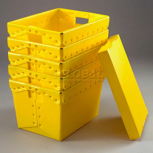 Lightweight, yet tough, this corrugated plastic tote is steel band reinforced at the top for added strength and rigidity. Easy to clean, resistant to dirt, moisture and grease. Convenient hand holes for easy carrying. Snug fitting lid protects contents against dust and dirt. Nests for space saving storage. Meets US Postal Service requirements.