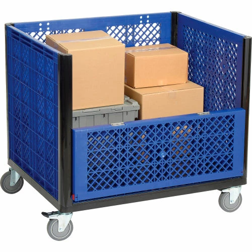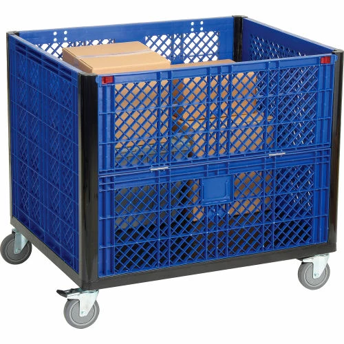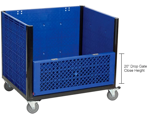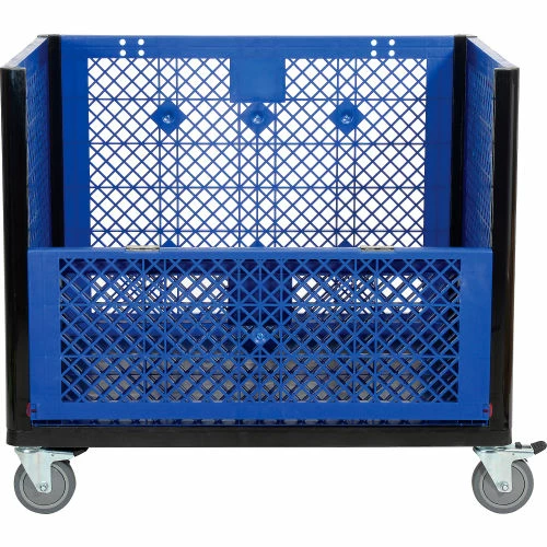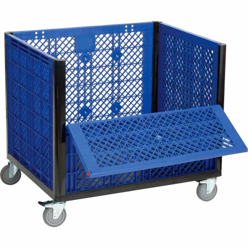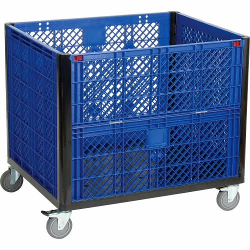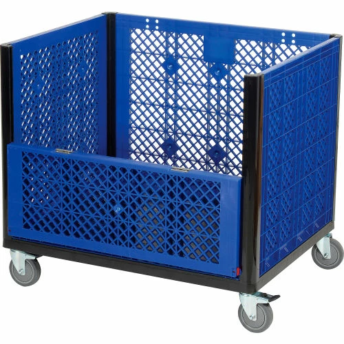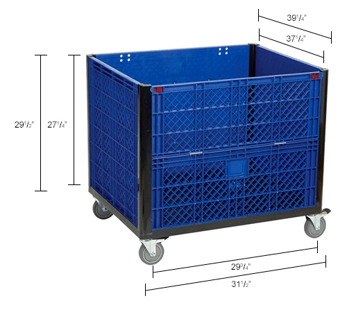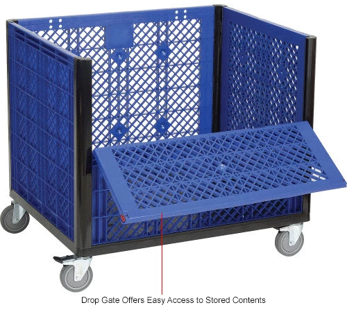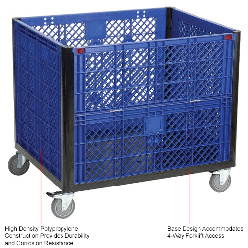 This structurally reinforced bulk storage container is made from high density blue polypropylene for a total capacity of 600 lbs. Stacks up to 4 high for a total of 2000 lbs. and includes 4 feet for stacking. Vented panels allow light, air and sprinkler circulation. Feet also allow 4-way forklift access. 1 hinged drop door for easy access to contents. Spring latches automatically lock sidewalls for set-up and quick folding. Measures 39-1/4″L x 31-1/2″W x 34″H overall. Bulk containers are shipped flat for reduced shipping. Posts and panels are easy-to-assemble to base using included hardware.