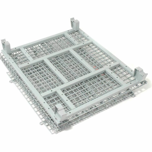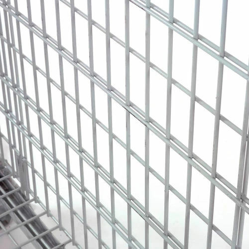 Open mesh construction provides excellent visibility, easy inventory control and eliminates dust and dirt build up. This one piece heavy-duty container features wire mesh arc-welded to a channel formed steel base. Sides and corners are heavily reinforced. Notched, positive stacking legs permit handling by forklift or pallet truck. Drop gate allows access when stacked. Durable powder coat finish resists rust and corrosion. Sets up in seconds.
