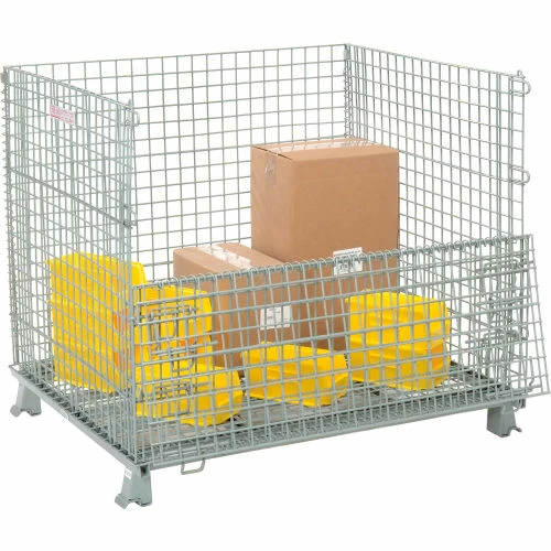 Store contents easily with the Global Industrial Folding Wire Container, made of 11-gauge, 2″ x 2″ wire mesh. This collapsible container sets-up in seconds and folds flat to save space. Heavy duty wire mesh container provides excellent visibility and easy inventory control. The notched, positive stacking legs on this folding container permits handling by forklift or pallet truck. Open-mesh construction provides excellent visibility, easy inventory control and eliminates dust and dirt build up. This one-piece heavy-duty container features wire mesh arc-welded to a channel formed steel base. Sides and corners are heavily reinforced. Notched, positive stacking legs permit handling by forklift or pallet truck. Drop gate allows access when stacked. Durable powder coat finish resists rust and corrosion. Sets up in seconds. Add a hinged lid and padlock for security. Mobilize your container by adding the caster kit. Keep contents hidden, secure, and dust free with the durable nylon cover (Each sold separately). 1-Year Limited Warranty.