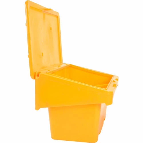 Ideal for storing salt, sand, garbage, pool chemicals, spill kits and anything requiring protection from the elements. Watertight Global Industrial Outdoor Storage Bins are built to withstand a wide range of conditions from sub-zero temperatures to extreme heat. Molded of moisture-resistant rotationally-molded polyethylene, these durable bins will not rust, dent, or corrode. Double wall hinged locking lid (padlock not included) closes securely keeping out rain, snow and sun. Unique stackable and nestable design saves on storage space and shipping. 2-way fork access. 5 year limited warranty.