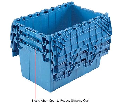 Safe, Secure, and Sustainable. The improved all plastic attached lid container leads the industry in design and proven performance. Taken out was the traditional metal hinge –replacing it with a safer and more durable all plastic hinge. This series of plastic shipping containers is the choice of much of the distribution industry. Manufactured from high grade-high density polyethylene plastic, the enhanced storage container is made to ship, store, and distribute goods and products in the toughest of environments. The all new plastic hinge design means there is no metal in the hinge of the container –making this container the safest and most sustainable in the market. Raised lip edges allow secure stacking. The attached lid container saves money too while allowing empty containers to nest inside each other when not in use. Molded grip handles have an integral hasp to accept cable ties for security. The Best Value plastic storage container offers increased safety and durability –all at a great value.
