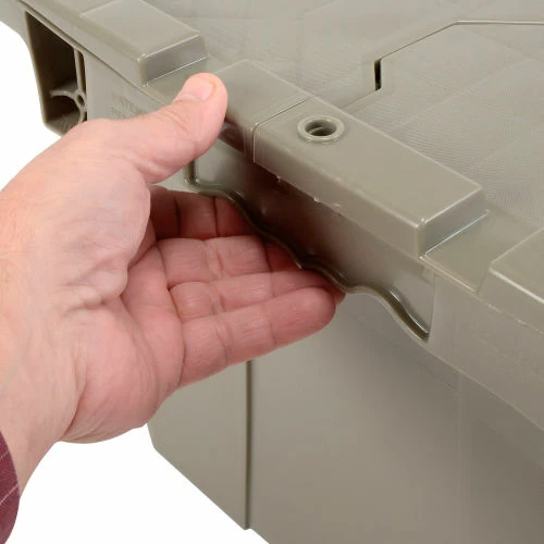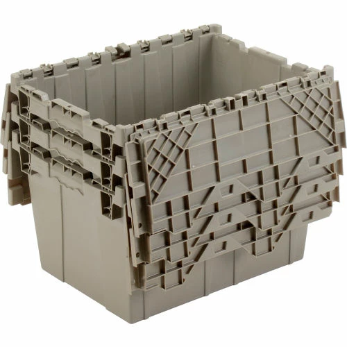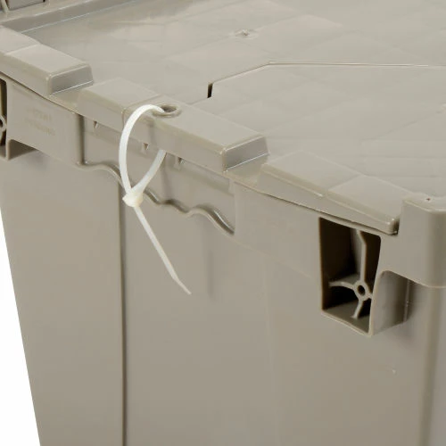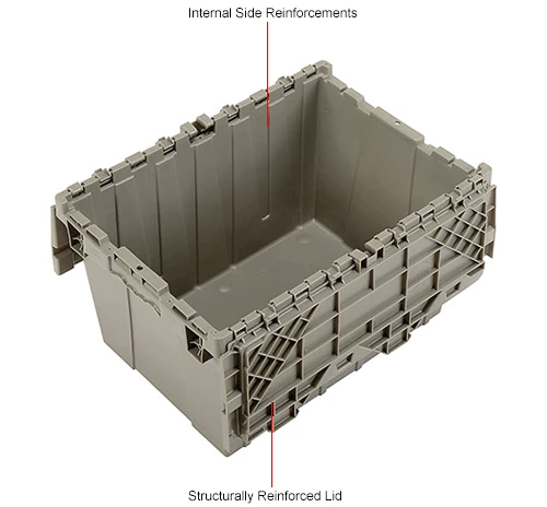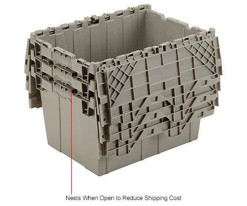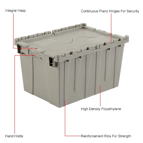 Need it safe, secure, and sustainable? The Global Industrial™ Plastic Shipping Storage Tote With an Attached Lid is an ideal choice for the distribution industry. Manufactured from high grade-high density polyethylene plastic, the enhanced storage container is made to ship, store, and distribute goods and products in the toughest of environments. The all-new plastic hinge design means there is no metal in the hinge of the container –making this container the safest and most sustainable in the market. Raised-lip edges allow secure stacking. The attached lid container saves money too while allowing empty containers to nest inside each other when not in use. Molded grip-handles have an integral hasp to accept cable ties for security. The Best Value plastic storage container offers increased safety and durability – all at a great value.