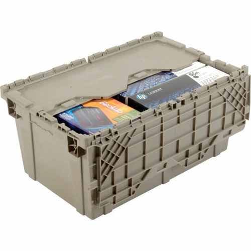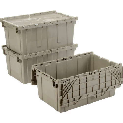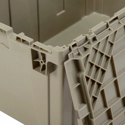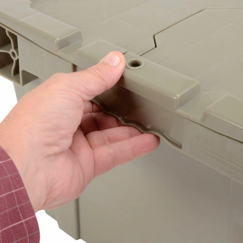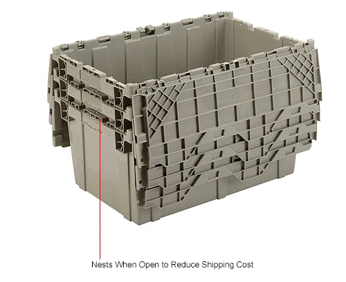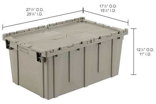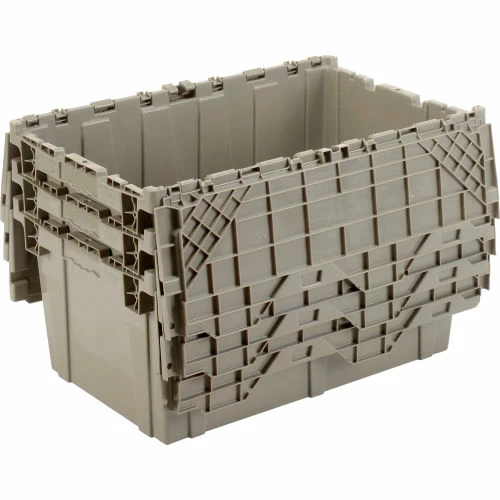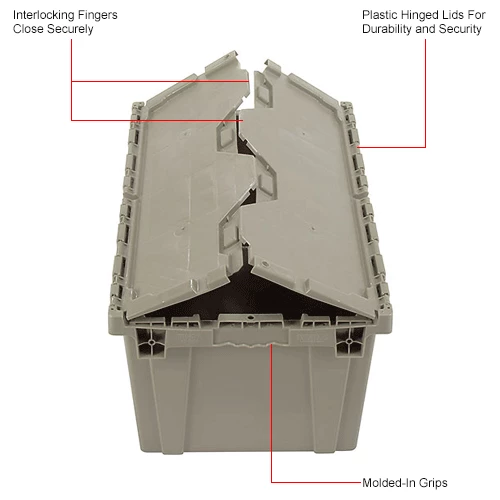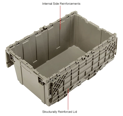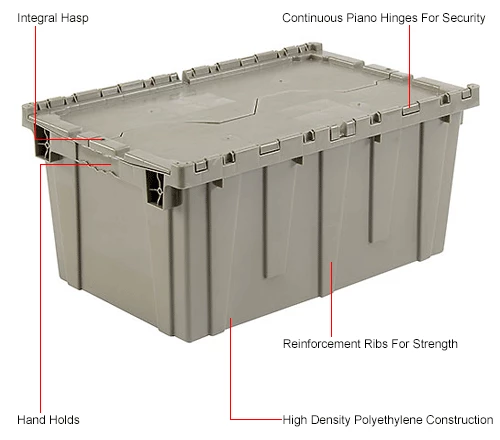 Simplify shipping container storage news with our Global Industrial Shipping & Storage Container with Attached Lid, a premier choice for many in the distribution industry. It features an improved all-plastic attached lid container that leads the industry in design and proven performance. Manufactured from high grade-high density polyethylene plastic, the enhanced storage container is made to ship, store, and distribute goods and products in the toughest of environments. The all-new plastic hinge design means there is no metal in the hinge of the container – making this container the safest and most sustainable in the market. This storage container offers increased safety and durability – all at a great value.
