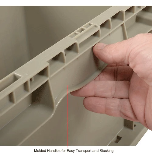 Efficiently transport goods or work in progress. These injection molded, high density gray polyethylene containers have reinforced corners to handle even the heaviest items, offering a stacking capacity of 50 lbs. Straight-walled sides allow various sizes to stack securely and fit accurately on standard sized pallets. Comfort grip handles on 2 sides.