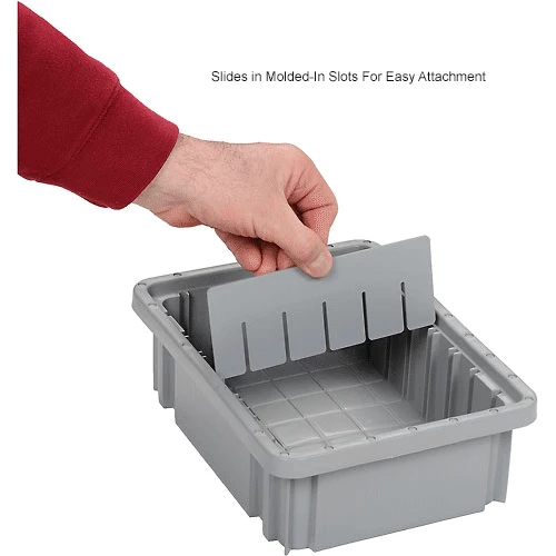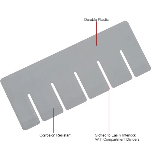 Durable, corrosion resistant plastic dividers help compartmentalize your grid boxes and dividable containers for efficient, organized storage. Grid Container Dividers are slotted to accept cross interlocking with Length Dividers (sold separately). These Plastic Grid Container Dividers are gray and sold in packages of 6.