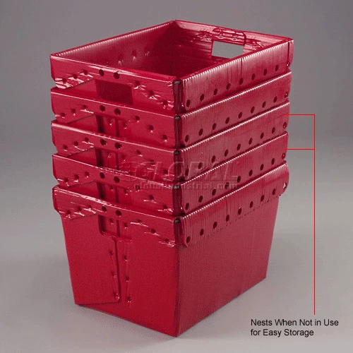 Lightweight, yet tough, this corrugated plastic tote is steel band reinforced at the top for added strength and rigidity. Easy to clean, resistant to dirt, moisture and grease. Convenient hand holes for easy carrying. Nests for space saving storage. Meets US Postal Service requirements.