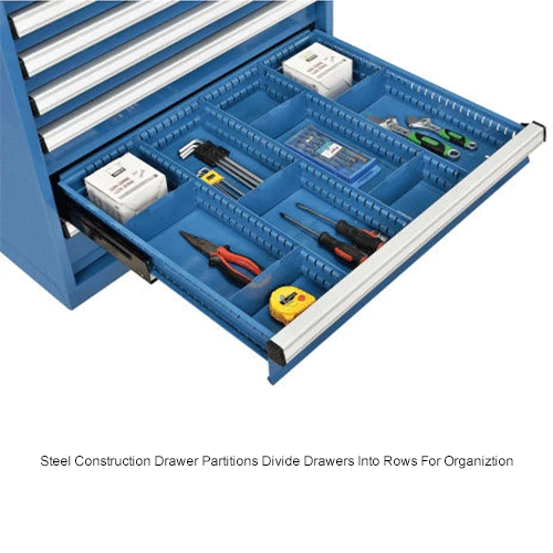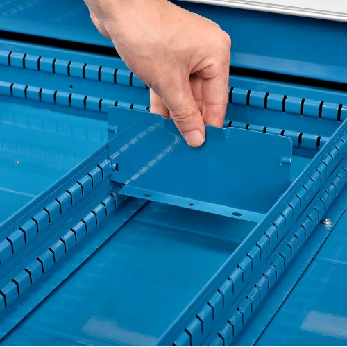 Metal Divider Kit for Paramount™ Modular Cabinets includes 3 long partitions and 6 short dividers. Partitions divide drawers into rows, and Dividers define compartments within the rows. Partitions and Dividers are adjustable to allow flexibility of drawer subdividing for the highest density storage. Partitions can be locked into place by the included screws. Partitions install (6-1/2″) apart. Blue color.
