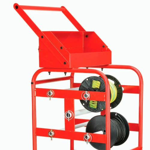 Pays out wire quickly and easily. Evenly spaced out axle design provides room for assorted wire spools (up to 4-3/4″ diameter). Includes 8 axles 3/4″ diameter and 2 axles 1 1/8″ diameter. 6″x2″ non-marring rubber wheels. Rugged 16 gauge welded steel frame is constructed of 3/4″ tubing with durable powder coated bright orange finish for long lasting durability. Overall caddy dimensions are 31″ H x 16″D x 14″W.