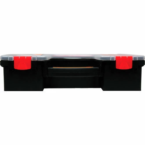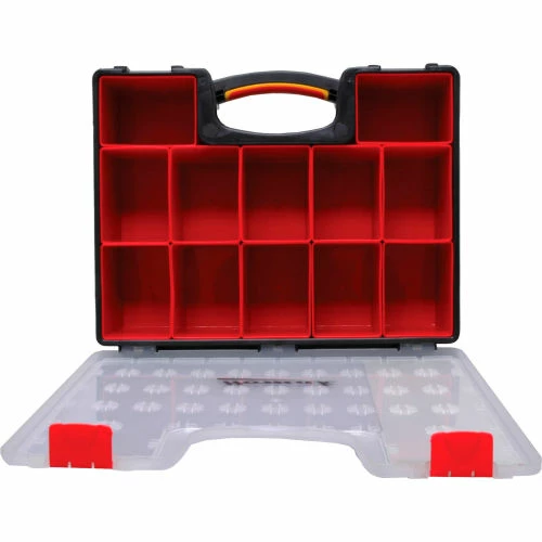 Plastic storage boxes and organizers are great for storing and organizing small parts & hardware. Made using durable, impact resistant plastic. Includes a transparent lid for clear viewing of contents. Lid is secured with two plastic latches. Plastic Organizers include small and large removable plastic bins and an easy-grip handle. Organizer has 12 removable bins. Bin dimensions 3″x 1-3/4″x 2″