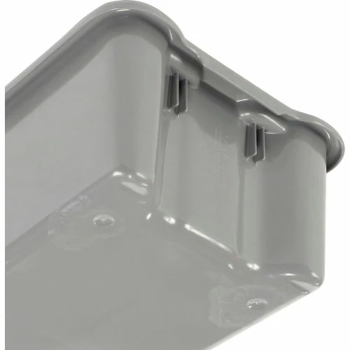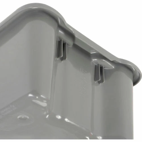 Designed to endure years of rugged use, these plastic containers are ideal for manufacturing, food processing, distribution and storage. High density polyethylene resists oils, solvents, most chemicals and steam and withstands 0° to 120°F. These Gray plastic containers are FDA approved for direct food contact. Reinforced construction provides 70 lb. capacity per container. Stacks when full – Bottom container supports 300 lbs. when stacked. Nests when empty at an alternating 180 degree position. Sold in packages of 5.