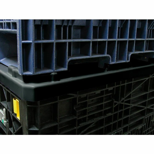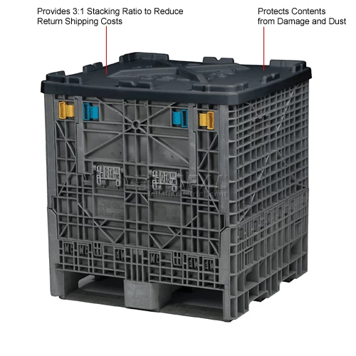 100% black polyethylene, resists rust, odors and moisture. 3:1 stacking ratio for money-saving return shipping.