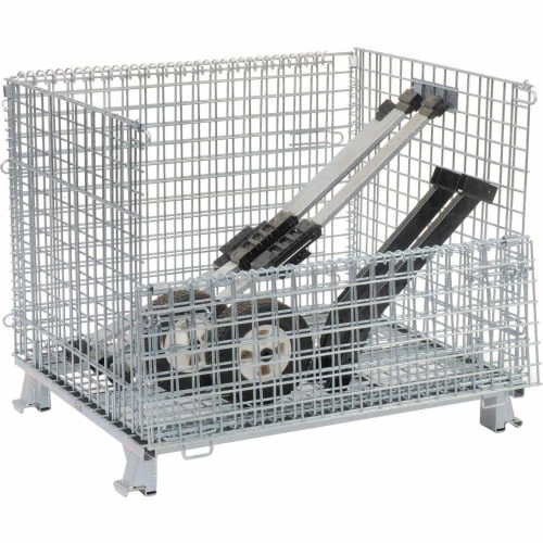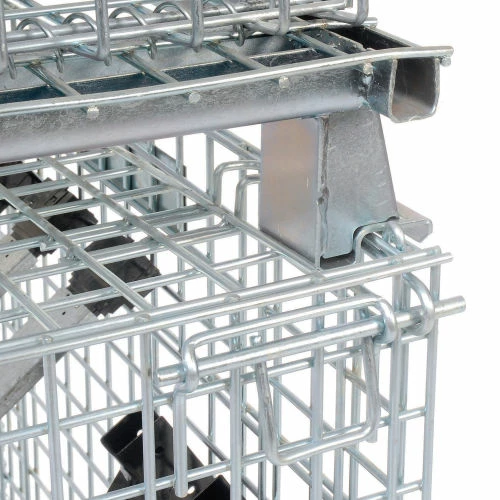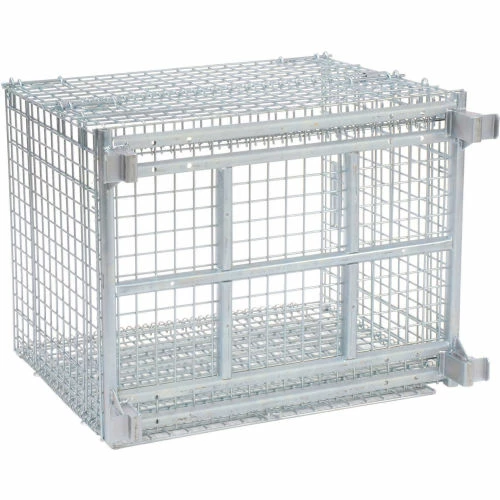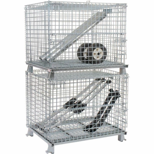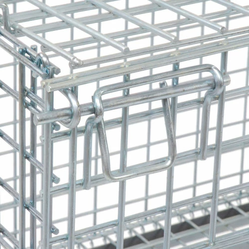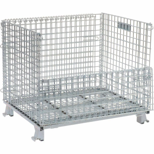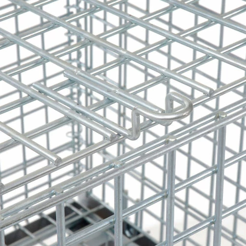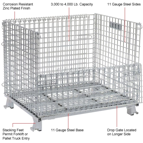 Folding wire containers efficiently maximize any storage space. These wire containers are collapsible to set up in seconds and fold flat to save space and reduce return shipping costs. Open wire mesh provides excellent visibility for easy inventory control. Wire storage containers help eliminate dust and dirt build up. Notched, positive stacking legs permit handling by forklift or pallet truck. Drop gate allows access to contents, even when stacked. Corrosion resistant zinc-plated finish.