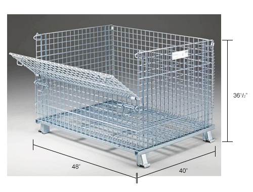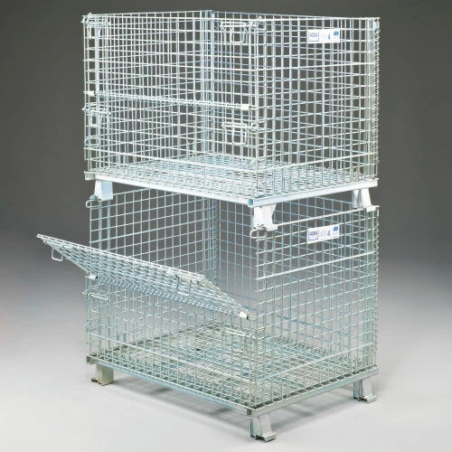 Folding wire containers efficiently maximize any storage space. These wire containers are collapsible to set up in seconds and fold flat to save space and reduce return shipping costs. Open wire mesh provides excellent visibility for easy inventory control. Wire storage containers help eliminate dust and dirt build up. Notched, positive stacking legs permit handling by forklift or pallet truck. Drop gate allows access to contents, even when stacked. Corrosion resistant zinc-plated finish.