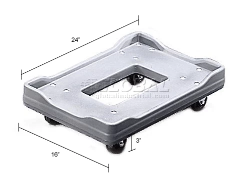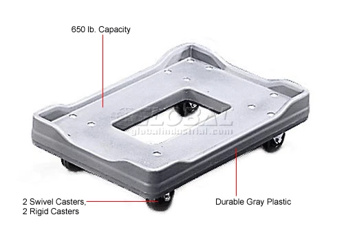 Made of durable gray plastic. Plastic Dolly allows mobility of stacked containers. Includes casters for easy mobility.