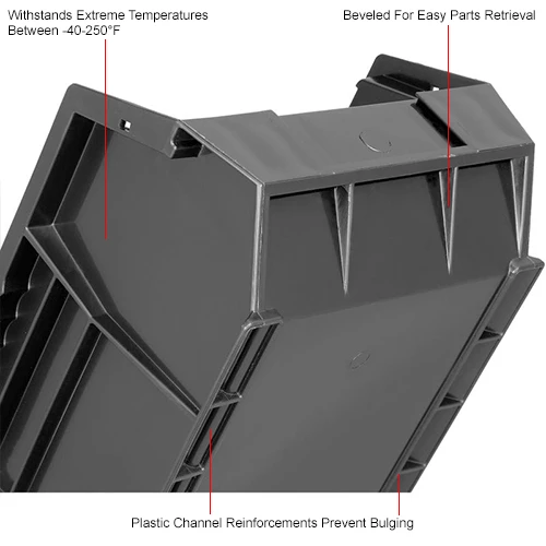 Reinforced walls add strength and rigidity and wide top ledge permits stable, higher stacking. Constructed of water and corrosion proof polypropylene, they withstand freezers and autoclaves from -40°F to 250°F. FDA Compliant Resin & Colorant. Includes a full-width hanger lip for use with louvers below. Anti-slide stop prevents shifting when stacked. Slotted label holders allow easy identification of contents.
