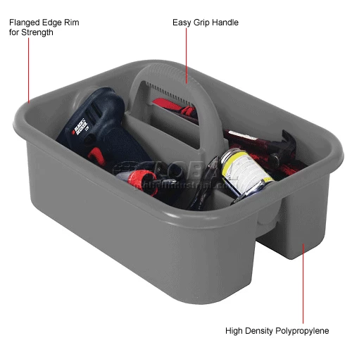 Industrial strength, hand held plastic tool caddy stores and transports tools and supplies. Made with high density polypropylene reinforced with ribs for support. Deep compartments on these plastic caddies hold tools, supplies and loose parts. Comfort grip handle for easy lifting. Plastic tool caddy nests when empty for compact storage. Measures 18-1/4″L x 13-3/4″W x 8-3/4″H. Sold in carton quantities of 6.