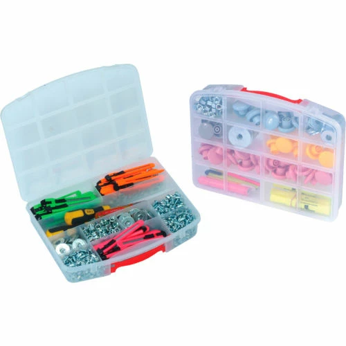 These compartment boxes help store and organize small to medium parts and supplies while allowing portability to where they’re needed. Take your small tools and parts where you need them with these handy storage cases. 10 Compartment Organizer is made of clear polypropylene plastic for easy viewing of contents. Includes 10 fixed compartments for small to medium parts. Comparment Dimensions: (2) 6-1/8″W x 2-9/16″D, (1) 12-3/16″W x 2-5/16″D, (2) 2-13/16″W x 2-3/16″D, (2) 3-1/8″W x 2-3/16″D, (2) 2-11/16″W x 1-12/16″D, (1) 6-7/16″W x 1-1/2″D. Sold in carton quantities.