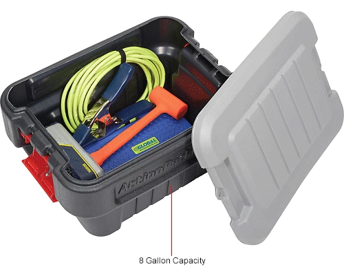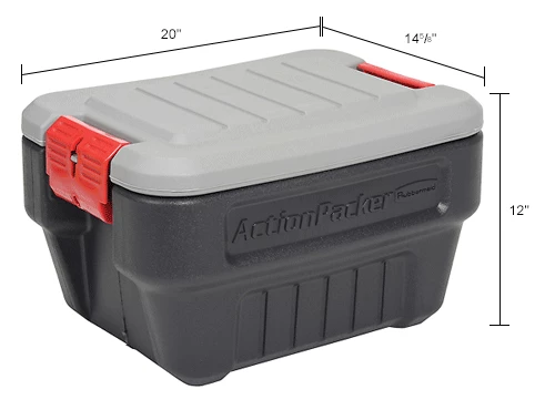 The ActionPacker™’s rugged construction makes it tough. Features tough, lockable latches (lock sold separately) This Rubbermaid® (Rubbermaid) ActionPacker™® storage container is made to take whatever you throw at it. Plus, you can use a bungee cord to secure the container (bungee cord not included). Outside bottom dimensions are 10-1/2″ x 14-1/2″. Price per each container, sold in carton qty.