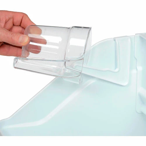 The Rubbermaid ProSave Ingredient Storage Bin features a dual opening and closing lid design. It provides access to ingredients while stacked, on a shelf or under a prep table. The lid locks onto base to protect ingredient integrity. Clear windows and ingredient labels allow easy content identification. The FIFO (First In, First-Out) barrier supports proper rotation of ingredients for improved quality and safety. Durable container base with smooth surfaces helps maintain cleanliness. Clasp secures lid on base to protect ingredient quality. Bin has front and rear handles for convenient carrying. 17″ height fits on most storage racks. Includes a 2 cup integrated scoop that also assists to comply with FDA food code 3-304.12. NSF Certified