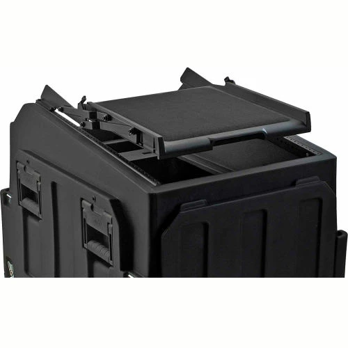 The SKB-AV14 Audio Video Shelf features a 16.5″ x 16″ shelf on a hinged anodized steel bracket that attaches to the top two units of the SKB19-R1406 Mighty GigRig or the SKB19-R1400 Gig Safe. With a convenient hook and loop surface the hinged SKB-AV14 can remain intact, even with the lid on the SKB-AV14 Shelf Accessory is the perfect solution for securely transporting mobile rackmounted audio video equipment, laptop, light or a workspace at a convenient height. Shelf remains attached with cover on. Sturdy hook and loop surface for AV gear. Convenient workspace at a convenient height Special Note: Mounts to top 2U of the SKB19-R1406 GigRig or the SKB19-R1400 Gig Safe.