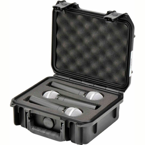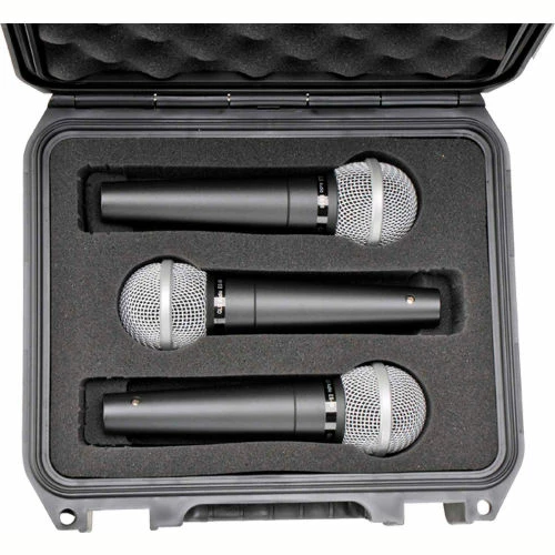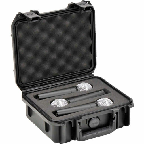 The 3i-0907-MC3 allows 3 mics to be stored horizontally. Each microphone cutout measures 1.5″ wide by 6.75″ long with two perforated removable foam pieces, one located on each end allowing microphone sizes up to 8.5″ in length. By removing the perforated foam piece near the grill of the microphone you can change the shape from being round to square. This will accommodate other popular hand held microphones with square style grills such as the Sennheiser and Electro Voice mics. The 3I-0907-MC3 case measures 9″ x 7″ x 4″ deep and is the most compact 3-mic case on the market. The case has convoluted foam in the lid for a compression fit and is covered by SKB’s Unconditional Lifetime Warranty. 3I Series injection molded waterproof cases are constructed of ultra high-strength polypropylene copolymer resin and feature a gasketed, waterproof and airtight, submersible design (IP67) that is resistant to corrosion and impact damage. Its continuous molded-in hinge, patented “trigger release” latch system, comfortable, snap-down rubber over-molded cushion grip handle, secure stacking, and automatic ambient pressure equalization valve (MIL-STD-648C) all contribute to its military grade design.