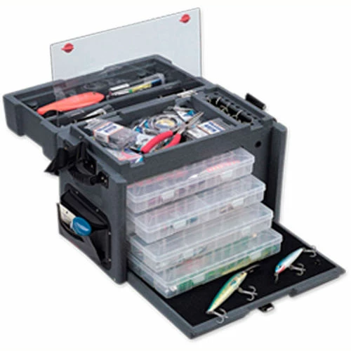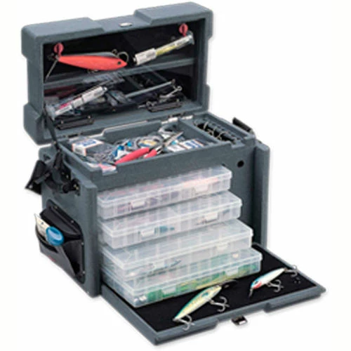 The SKB Tackle Box 7200 is made of indestructible rotationally molded construction with stainless steel hardware and fasteners. The lid opens 90-degrees or 180-degres to access time through a clear acrylic door. Four storage boxes with dividers keeps everything organized. A hanging jig area accommodates over 40 jigs and includes a padded cover to keep them in place. Two large pleated soft exterior pockets for various accessories and a removable shoulder strap makes for easy, convenient transport. Meant for the dedicated fisherman, the 2SKB-7200 is backed by SKB’s Unconditional Lifetime Warranty. Some SKB Tackle Box 7200 photos depict the Rocket Launchers which are optional equipment available separately. Made of indestructible rotationally molded construction. Stainless steel hardware and fasteners. The lid opens 90-degrees or 180-degres to access time through a clear acrylic door. Four storage boxes with dividers keeps everything organized. A hanging jig area accommodates over 40 jigs. Rod Tubes sold separately Unconditional Lifetime Warranty.