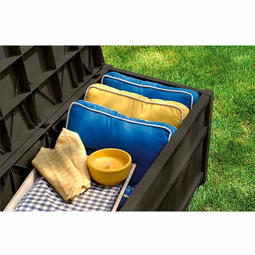 This deck box with seating capabilities is great for storing outdoor accessories. All weather construction provides water resistance and UV protection for up 10 years. Great for storing furniture, cushions and outdoor accessories. Easy to maintain, minimal tools required. 50 gallon capacity.