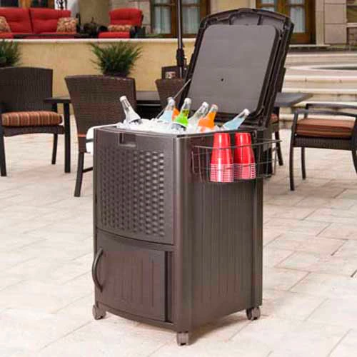 Perfect for your deck, patio, balcony, or inside the garage or home. Durable contemporary design brings style and harmony to any outdoor setting. Ideal for keeping beverages nice and cold during long summer backyard barbecues. 77 quart cooler holds 72 beverage cans or 6 2-liter bottles. Wire basket holds additional cans, bottles, or entertainment accessories. Towel bar included. Rugged vinyl polypropylene resin construction. Weather Resistant stay-dry design won’t rust or dent and requires no painting. Easy snap-together assembly. Casters (2 locking and 2 non-locking) for portability.