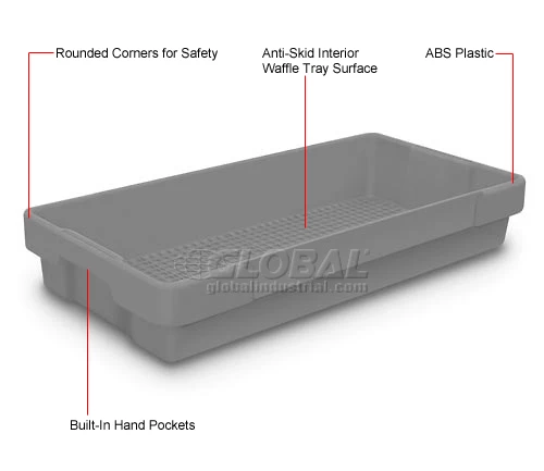 Utility trays are ideal for any application including mailrooms, supply storage and even security checkpoints. Made of ABS plastic with a matter finish. Plastic trays are nestable when empty for compact storage. Built-in hand pockets for easy lifting. Rounded corners for safety. Interior tray surface features an anti-skid waffle design. Measures 26″L x 12-1/2″W x 4-1/2″H.