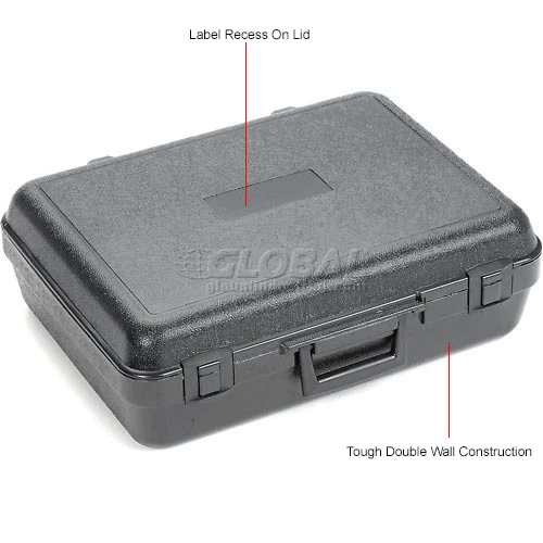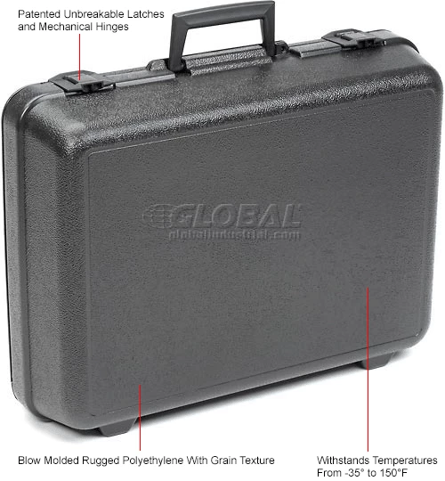 Blow Molded Rugged Polyethylene Cases feature tough double wall construction can’t rust chip or corrode withstand termperatures -35 degrees F to +150 degrees F. Patented unbreakable latches and mechanical hinges. Label Recess area on lid. Grain texture with rugged handles. All cases include a Pinch & tear foam sets to protect the contents. Whether you need to carry ship organize or protect your products blow molded cases are the economical choice. Perfect for salesman sample kits electronic equipment medical products instruments etc. Color black. 18″ Base Length; 13″ Base Width