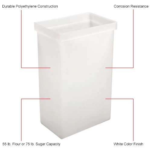 Optional White Bin for Winholt® Triple Ingredient Bin Cart. Heavy duty plastic bins are constructed of seamless, one-piece, sanitary polyethylene. Will not chip, corrode or rust. Ideas height, coveniently fits under work tables saving valuable space. Total capacity per bin is 55 lbs. flour or 75 lbs. sugar. Bins and lids (sold separately) are interchangeable with other brands.